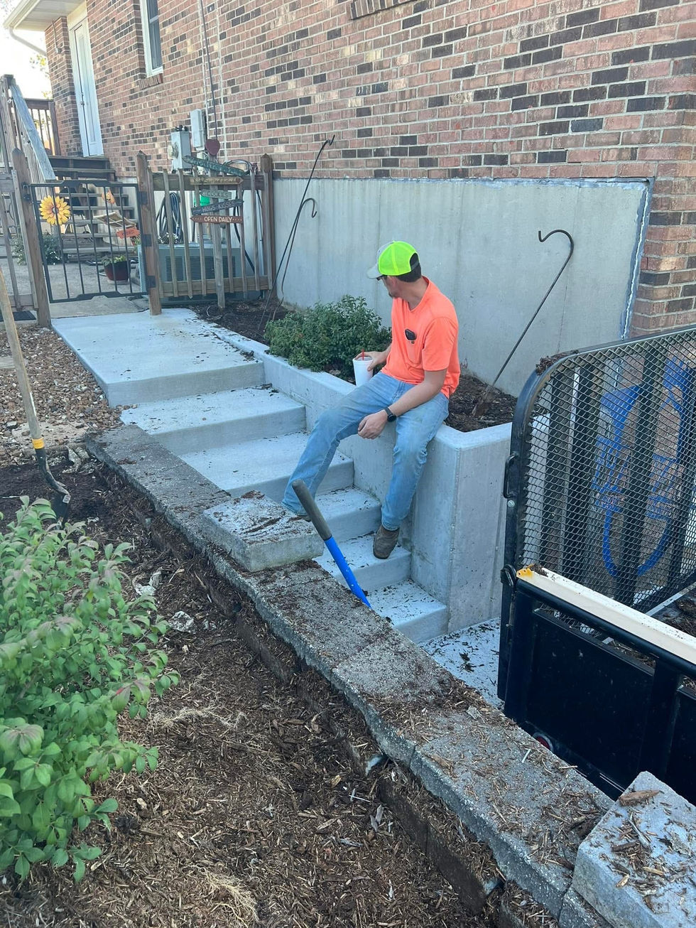 A collection of images showcasing various landscape design projects, including garden landscaping, stone borders and flower beds. The Reynolds project is flower bed tune up with weed suppression fabric and fresh rock.